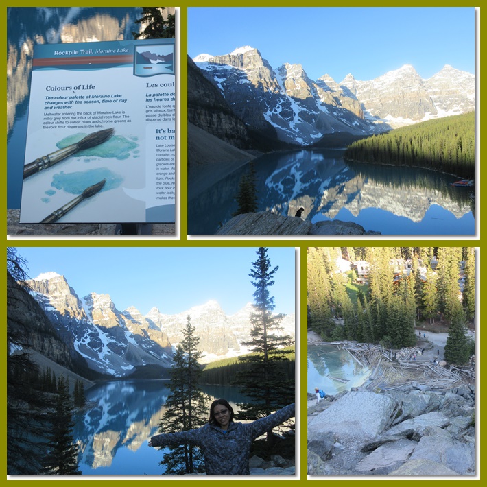 Kalo lewat jalan ini mah gampang banget. Ga sampe 10 menit kami sudah ada di puncaknya. Wow.. pemandangan Moraine Lake pagi ini beda lagi dengan kemarin sore. Pantulan gunung es terlihat jelas di danau. Betul2 seperti melihat pemandangan yang berbeda. Dari atas sini, kami juga bisa melihat ke bawah, ke log kayu tempat Diana kemarin terperosok. Jauh juga ya ternyata di bawah sana.
