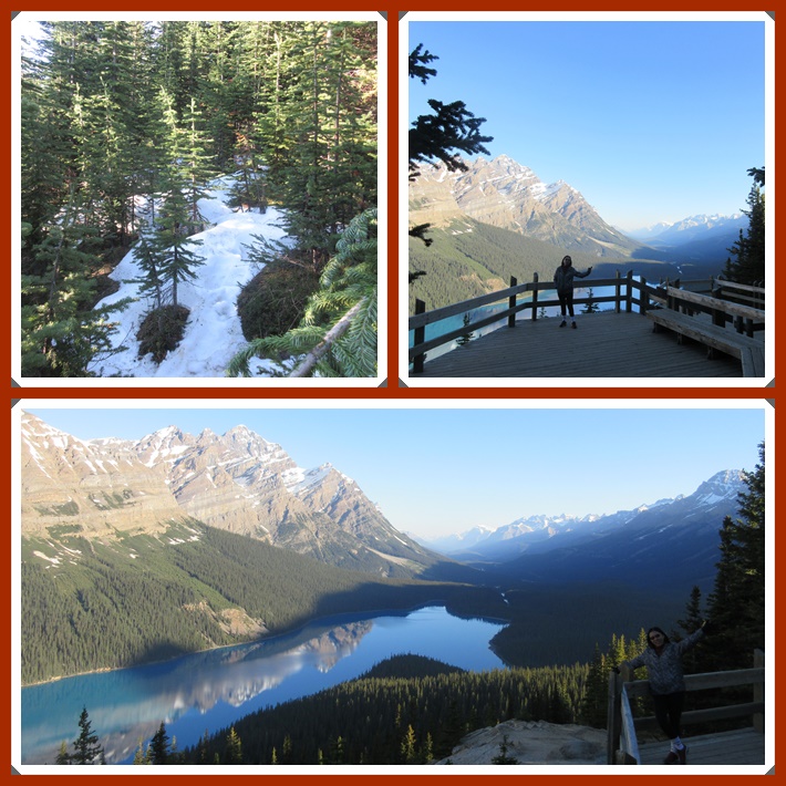 Sepertinya ga akan pernah puas ya memandangi alam seperti ini. Jadi ya dengan terpaksa kami melanjutkan perjalanan. Kali ini cari Bow Summit, untuk melihat Peyto Lake dari atas. Parkiran Bow Summit masih kosong. Dari situ kami harus jalan menanjak sekitar 10 menit. Masih terlihat gomplokan salju yang belum mencair di beberapa tempat. Daaaan… taraaaa… akhirnya ada anjungan kayu untuk melihat Peyto Lake yang terkenal dengan bentuk seperti bintang di ujungnya. Itu dia… keren ya. Peyto Lake pagi ini belum sepenuhnya disinari matahari, jadi seperti Bow Lake, danau ini memantulkan bayangan gunung di atasnya. Karena dilihat dari kejauhan dan dari atas, maka sudah mulai terlihat berwarna biru.