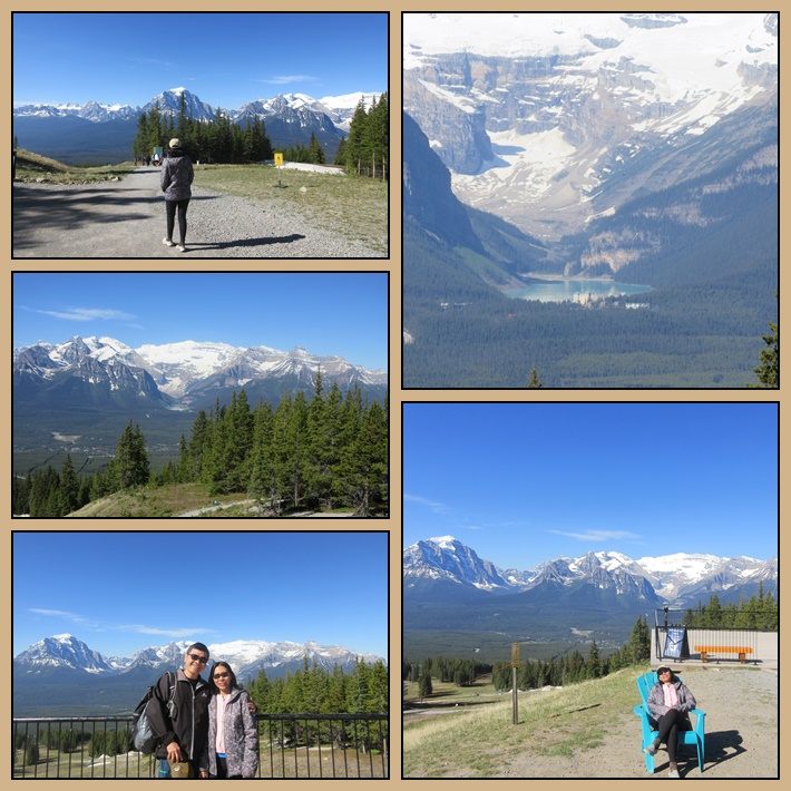 Tiba di atas, ada deck kayu dimana kita bisa menikmati pemandangan ini dengan leluasa dan juga bisa berfoto dengan latar belakang pegunungan ini. Di kejauhan tampak ada danau, itulah Lake Louise dengan hotel Fairmont Chateau nya.