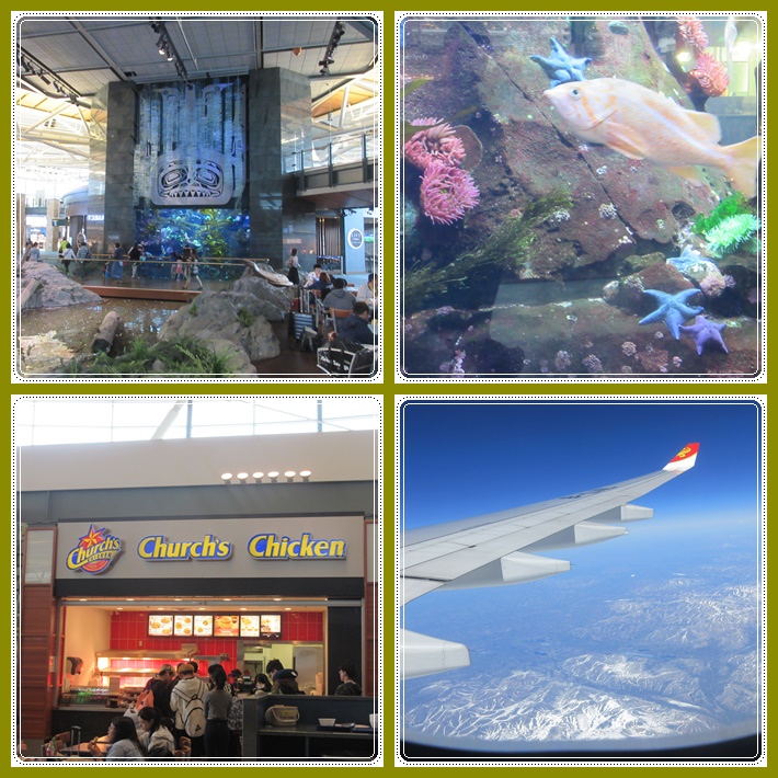 Di dalam airport, ada banyak tempat makan dan toko2 souvenir. Yang tidak biasa adalah adanya akuarium raksasa yang memperlihatkan aneka ikan dan berbagai biota laut lainnya seperti bintang laut, terumbu karang, dsb. Semuanya warna warni cakep banget. Kami makan siang di restoran church’s chicken yang lambangnya sama persis dengan texas fried chicken di Indonesia. Ternyata memang sama menu dan rasanya, cuma beda nama saja.