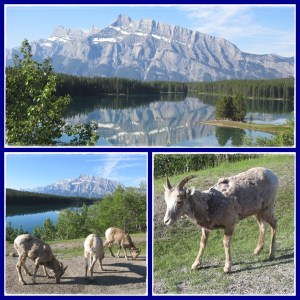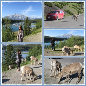 Makanan mereka adalah mineral yang terdapat di batu2an gunung. Jadi mereka akan menjilati batuan itu untuk mendapatkan makanan mereka. Terlihat batu2 di pinggir jalan itu jadi basah setelah mereka menempelkan mulutnya ke situ. Jadi bukan merumput, tapi menjilati batu. Menarik ! Senang sekali kami melihat domba2 ini sambil menikmati keindahan Two Jack Lake dengan gunung es yang menjulang megah.