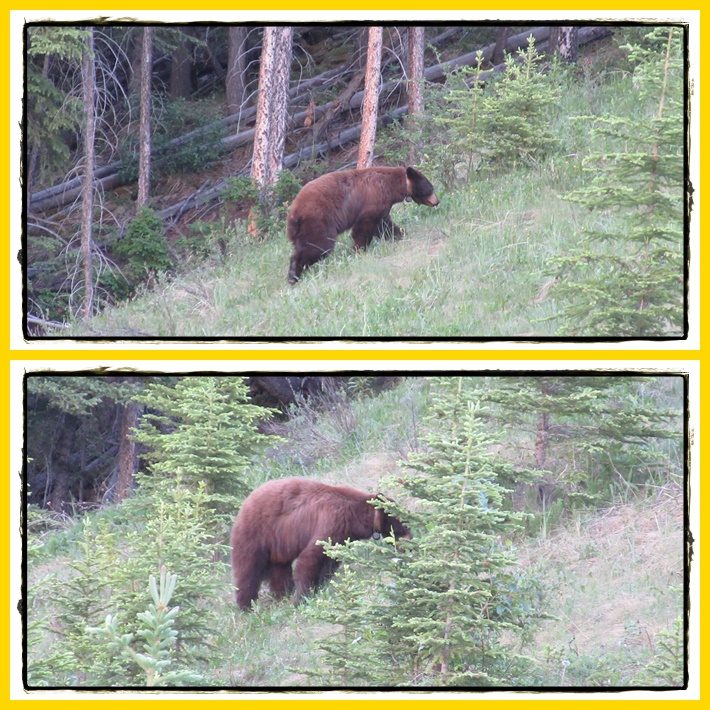 Jenis beruang ini bukan grizzly karena tidak memiliki punuk, jadi termasuk jenis black bear. Namun jangan salah, black bear warnanya bisa macam2, tidak selalu berwarna hitam, bisa juga berwarna coklat seperti yang ini. Moment luar biasa ini sangat kami nikmati. Memperhatikan black bear langsung di habitatnya. Cukup lama kami berhenti di tengah jalan, jadi bikin antrian mobil nih di belakang kami, haha.. Biarin aja, di sisi berlawanan juga begitu kok. Rasanya, Tuhan begitu baik sama kami. Memberikan lebih daripada apa yang kami harapkan. Melihat grizzly bear dari kejauhan saja kami sudah sangat senang. Apalagi ini, bisa lihat beruang jenis lain lagi, di pinggir jalan dekat kami, lebih dari 5 menit. Mau ga mau kami harus terus melanjutkan perjalanan walau beruangnya masih santai di situ. Bye beruang !