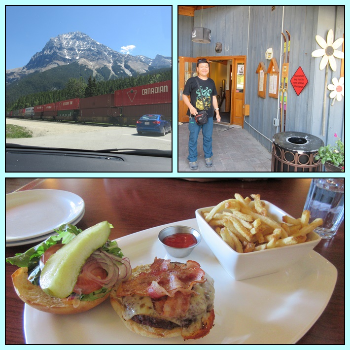 Kami sempat mampir untuk makan siang di kota Field. Masuk dari samping Visitor Centre di tepi Kicking Horse River. Ternyata di situ ada rel kereta api dan keretanya mau lewat. Ini kereta barang yang ternyata bisa membawa ratusan container. Jadi kami berhenti di situ ada sekitar 15 menit, sampe mobil2 sudah pada matikan mesin dan pengemudinya jalan2. Parah juga nih, bukan cuma 1-2 menit berhenti seperti di Indonesia.