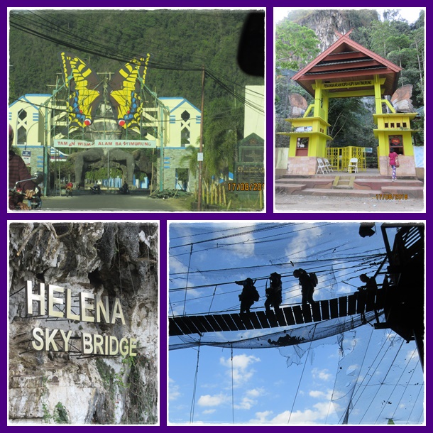 - Penangkaran Kupu-Kupu Bantimurung. Bayar tiket Rp. 17.500,- untuk Helena Sky Bridge dan Rp. 5.000,- untuk masuk area wisata. Ternyata di sini objek wisata utama dan terbarunya adalah Helena Sky Bridge. Dibuka sejak akhir tahun 2017, memiliki panjang 200 meter dan tinggi 50 meter di atas permukaan tanah. Jalannya cukup mendaki dan lumayan antri untuk menyeberangi Helena Sky Bridge. Rupanya untuk nyebrang jalurnya sempit, hanya bisa 1 arah. Trus kebanyakan semua lama berfoto2 di atas jembatan, jadi yah antri. Kami dipasangi tali pengaman dan harus naik ke atas tower.