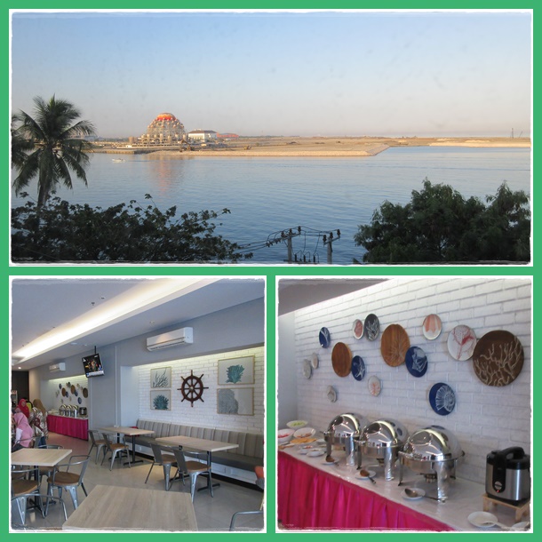 Sarapan pagi cukup sederhana. Ada nasi putih, 3 macam lauk/sayur, roti, teh, kopi dan buah2an. Cukup lah buat mengisi perut pagi hari. Kan nanti juga mau kuliner lagi, hehe.. Tempat makan cukup luas dan dekornya modern, ada view mengarah ke Losari juga. Sama seperti dari kamar kami, bisa melihat pantai hasil reklamasi di kejauhan dengan beberapa proyek pembangunan yang sedang berlangsung.