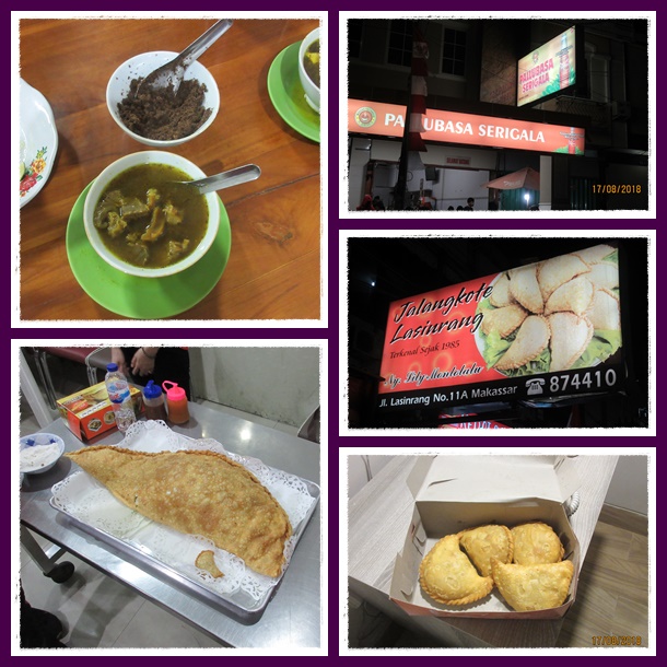 - Jalangkote di jalan Lasinrang. Jalangkote adalah pastel khas Makassar yang isinya padat. Di jalan Lasinrang ini sebenarnya ada beberapa pedagang jalangkote. Namun Jalangkote Lasinrang termasuk yang paling terkenal. Dalam menyambut HUT RI, ada diskon khusus 33%. Jadi harganya dari semula Rp. 7.500,- menjadi Rp. 5.000,- per pcs. Wah lumayan juga, kami beli 5 dibungkus untuk makan di hotel nanti. Khusus hari ini, ada jalangkote berukuran raksasa yang juga dijual. Dibuat setahun sekali, bisa lihat di foto perbedaan antara jalangkote raksasa dengan yang biasa.