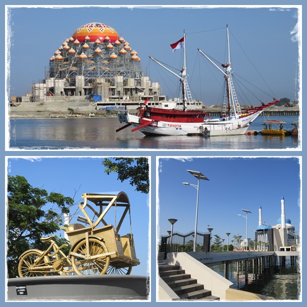 Kami jalan balik lagi ke arah hotel. Memang dari tepian Losari terlihat jelas proyek pembangunan masjid yang belum diketahui namanya itu, berada di atas tanah reklamasi. Katanya sih akan jadi icon nya Makassar nanti kalo sudah jadi. Kita juga bisa melihat berbagai kapal, termasuk kapal phinisi yang ada di sepanjang garis pantai. Ada juga berbagai monumen yang bisa jadi objek foto, salah satunya replika becak berwarna keemasan yang cukup menarik.