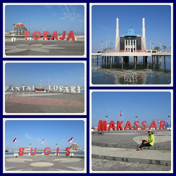Setelah sarapan, kami jalan menyusuri Pantai Losari. Ternyata panas juga nih, matahari bersinar terik. Di sepanjang pinggiran laut ini (tetap aneh kalo dibilang pantai, hehe) terdapat area pejalan kaki yang luas. Jadi nyaman untuk orang olahraga, lari pagi, kumpul2, duduk2 dan melakukan berbagai aktivitas. Banyak tulisan berukuran raksasa di sepanjang pantai Losari ini yang berhubungan dengan Sulawesi Selatan seperti Makassar, Bugis dan Toraja.