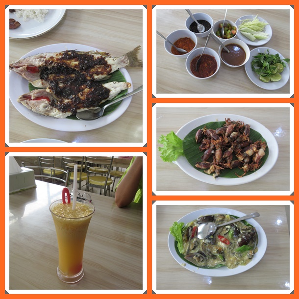 Nah, tadi beli buat dibawa pulang. Sekarang waktunya makan siang. Lanjut naik grab ke Rumah Makan Seafood Losari di jalan Lamaddukelleng, salah satu yang terkenal di Makassar. Lokasinya di seberang sekolah Rajawali. Di bagian depan kita memilih ikannya terlebih dahulu. Banyak ikan laut yang bisa dipilih, ada ikan kudu2 (berbentuk kotak) yang dimasak fillet. Kalo mau dibakar, ada ikan katamba. Dan banyak lagi yang lain. Kami pilih katamba dibakar dengan bumbu parape (manis). Selain itu juga pesan cumi teropong goreng asam dan kerang hijau saos tiram.