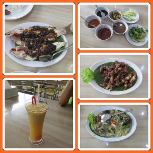 Semuanya enak ! Apalagi di sini dikasi 4 mangkok sambel yang beda2 semua jenis dan rasanya. Wah, Jeff doyan tuh sambel dabu2 nya. Kami juga pesan juice markisa yang asli dari buahnya. Rasanya segar dan mantap. Kalo di Jakarta yang namanya jus markisa pasti sirop. Selesai makan, ternyata dikasi es buah gratis. Wah, enak banget nih segar dan manis. Benar2 puas makan di sini. Selain enak dan kenyang, harganya pun murah. Ikan katamba tadi cukup besar untuk dimakan berdua, harganya cuma 65 ribu per ekor loh.