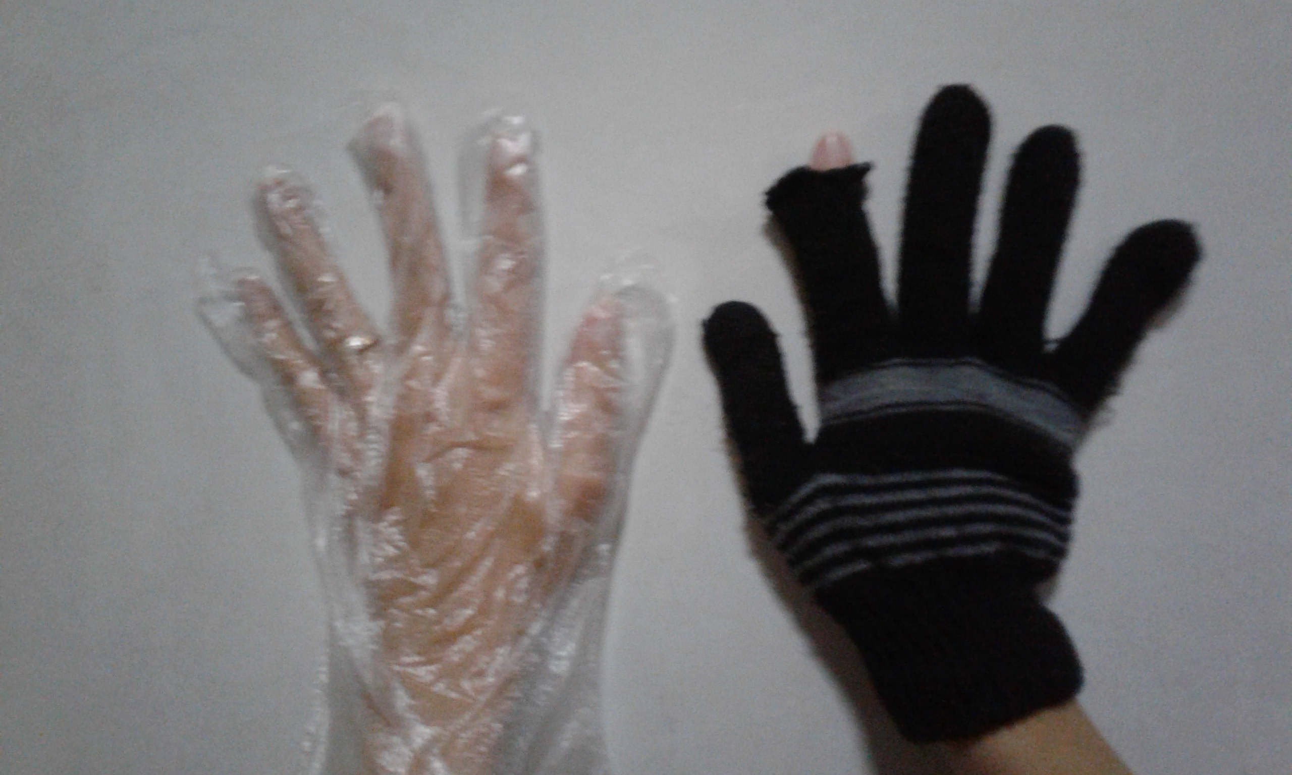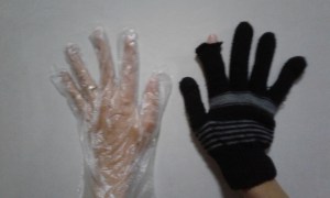 Nah, ini titik lemah saya. Ketika musim semi (spring) atau gugur (autumn) dengan suhu sekitar 5-10 derajat saja saya biasanya menggunakan sarung tangan karena tangan saya kedinginan. Apalagi ini, minus 20 derajat. Pasrah deh. Untuk sarung tangan, disarankan pakai 2 lapis. Lapis pertama bisa pakai sarung tangan plastik yang biasa untuk di dapur atau sarung tangan bahan kaos yang touchscreen. Selain hangat, dua model sarung tangan ini bisa digunakan untuk memencet hp saat berfoto. Saya punya kreasi sendiri untuk masalah touch screen ini dengan menggunakan sarung tangan kaos yang dilubangi bagian ujung telunjuk kanan nya, hehe..