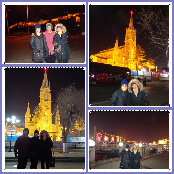 Betul saja, tujuan di Jilin harusnya ke Longtanshan Park. Tapi karena sudah gelap banget (jam 5 sore), maka kami hanya diperlihatkan dari jauh, lampu2 di bukit Longthansan yang katanya berbentuk naga. Entahlah harusnya begini atau gara2 sudah kemalaman. Kalo ikut tour mah, mana tau. Semua nurut aja dibawa ke mana. Dari situ kami dibawa ke JIlin Catholic Church. Ini gerejanya bagus banget. Mosaik kacanya keren. Pas gelap begini lampunya juga bagus, tapi sulit ditangkap kamera. Pakai mata saja, puas banget lihatnya, cantik !