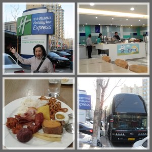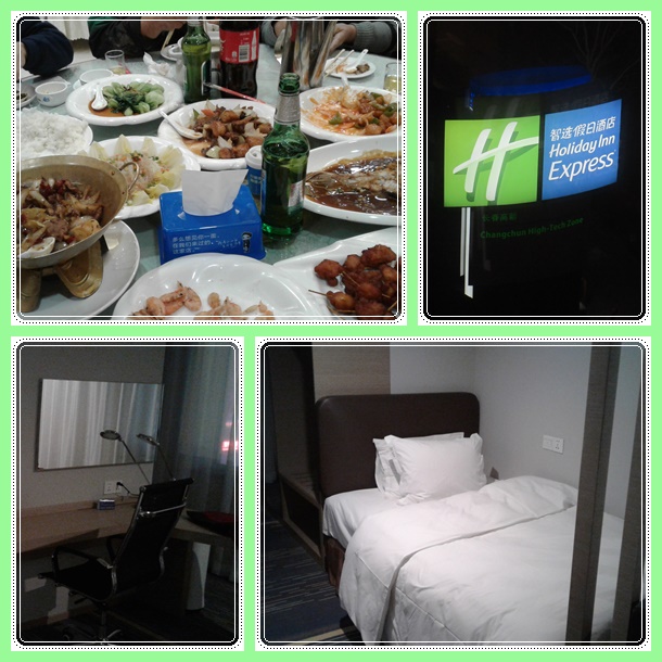 Dari suhu dingin, masuk restoran yang hangat dan makan itu rasanya enaaaak banget. Semua makanan ludes. Entah karena memang makanan nya enak banget atau kami yang sudah kelaparan karena makan yang ga jelas di pesawat, atau karena kami kedinginan. Kombinasi semuanya deh ! Malam ini kami menginap di Holiday Inn Express. Tidak besar tapi modern. Karena kami ber-3, maka dapat kamar yang triple untuk 3 dewasa. Di China model kamar ini cukup umum. Dahulu saat Diana & Jeff dan adiknya Jeff ke China pun kami selalu pesan triple room. Kamar triple nya di sini unik, jadi bed nya di area terpisah dan ada dinding pembatas nya. Jadi saat tidur tidak bisa saling melihat. Cukup menjaga privacy dan kamar nya pun luas di belokan, jadi bisa lihat pemandangan 2 jalanan dari jendela.