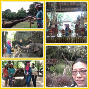 Yang menarik adalah saat show gajah, MC nya meminta 3 penonton untuk maju ke depan. Banyak yang mengacungkan tangan, salah satunya adalah Tyas, teman kami. Karena kami duduk paling depan dan Tyas mengacungkan tangan sambil degan semangat berdiri di atas bangku, jadilah dia ditunjuk untuk maju. Cieee… berani juga ya dia. Yang 2 penonton lagi pria wisatawan asing. Sampai di depan ternyata 3 penonton tadi bergiliran mendapat kalungan bunga dari sang gajah. Wah, keren ! Pengalaman tak terlupakan tuh.