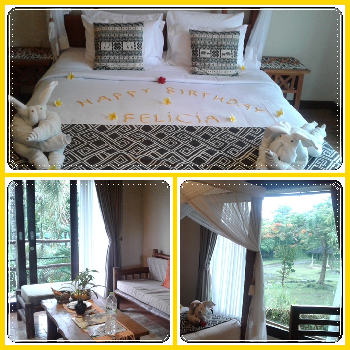 Buka pintu bungalow, langsung masuk ke ruang duduk yang ada TV dan terus ke balkon. Di kanan dan kiri ruang duduk itu ada kamar. Begitu buka kamar utamanya, taraaa…. surprise ketiga ! Ada dekorasi unik di kamar. Handuk yang dibentuk binatang serta tulisan Happy Birthday Felicia di ranjang, terbuat dari bunga. Cantik banget dekorasinya, bakalan ga ada yang berani tidur di ranjang ini sepertinya, haha.. takut rusak dekor nya.
