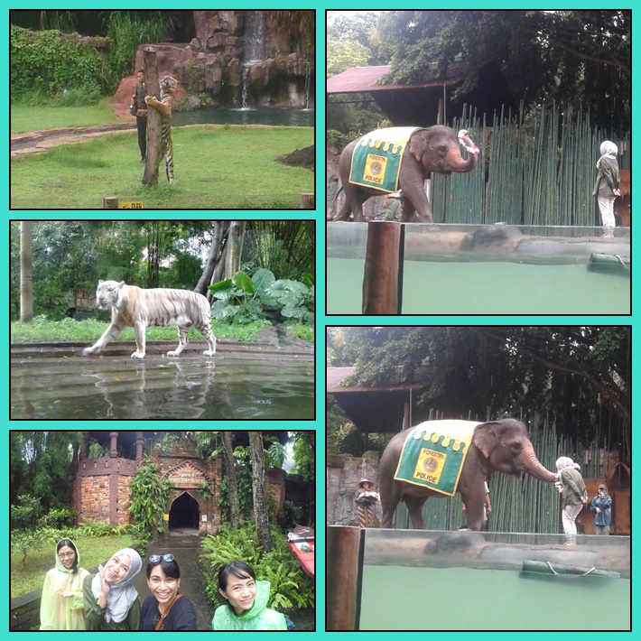 Yang pertama nonton tiger show (harimau). Di sini kami bisa pakai topi untuk menahan gerimis yang sudah mulai reda. Pertunjukannya bagus sekali, sangat edukatif, narasi menggunakan bilingual : Indonesia dan Inggris. Setelah itu lanjut nonton elephant show (gajah). Di sini tempat duduk penonton ada tenda di atasnya, jadi tidak kena hujan.