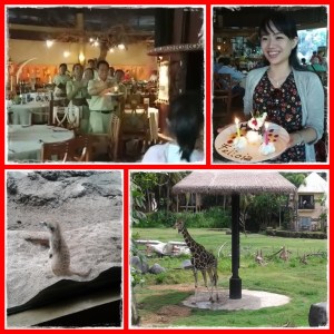 Sudah puas ya naik gajahnya ? Belum sarapan saja sudah seru banget acaranya. Nah, untuk sarapan juga ada agenda yang menarik, sesuai tag line restoran nya. Breakfast with the Lions (sarapan bersama para singa). Jadi selama kita sarapan, kita bisa melihat singa yang juga sarapan. Ada jam nya untuk lion feeding yang nanti diumumkan ke seluruh tamu restoran. Terus terang saja, selama sarapan kami heboh sendiri mengenang perjalanan naik gajah yang seru dan sibuk foto2 dengan background singa di belakang kami. Lalu foto meerkat yang lucu2 itu. Mana pagi ini ada binturong (seperti musang besar) yang diajak main ke restoran. Jadi tamu restoran bisa foto2 sama binatang unik ini. Udah ga fokus sama makanan nya nih, padahal makanan nya enak2 loh. Fokusnya malah sama binatang2 yang ada di sekitar kami. Nanti ke toilet pun bawa kamera, buat foto singa yang betina. Haduuuh.