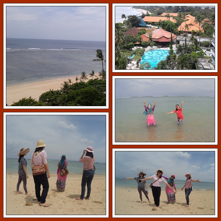 Pesawat Air Asia berangkat tepat waktu dan tiba lebih awal dari jadwal. Mantap dah. Begitu tiba di bandara Ngurah Rai, kami makan dulu di Ayam Betutu Khas Gilimanuk yang ada di airport. Ada paket 50 ribuan dengan isi yang cukup lengkap. Hanya saja makan di sini dikenakan tax dan service yang mahal yaitu 21%, waaah… udah kaya hotel aja, sayang amat. Setelah makan, kami naik grab menuju hotel Grand Inna Bali Beach. Di sini ada private beach milik hotel yang sangat luas, indah,  bersih dan sepi. Pemandangan pantai ini bisa dilihat dari balkon kamar loh. Keren banget !
