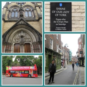 Ada pemandangan kontras di depan York Minster, yaitu persiapan kelompok LGBT yang akan parade nanti jam 11 siang. Ada beberapa pedagang dengan gerobak mereka yang menjual berbagai keperluan parade seperti topi, bendera, dan pernak pernik berwarna pelangi. Demikian juga toko2 yang ada di York terlihat memasang poster/ spanduk dengan tema pelangi. Terlihat juga bus2 yang disiapkan untuk parade.