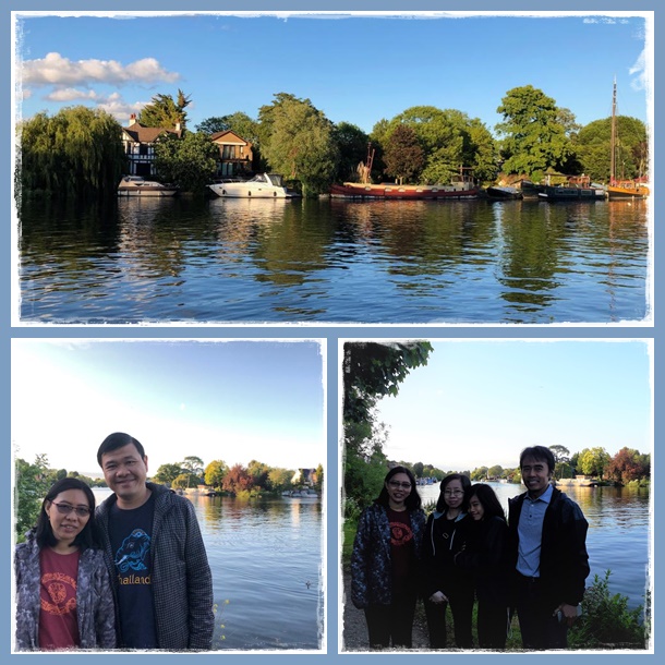 Hari ini bertepatan dengan hari ultahnya family Diana tersebut. Oleh karena itu, malam ini sudah janjian untuk dinner bersama di restoran khas Inggris yang terletak di Old Windsor. Sudah booking untuk 5 orang, jam 7 malam. Restoran nya penuh banget, kalo ga booking sepertinya akan susah dapat tempat. Makanan nya enak, porsinya besar, ada salad all you can eat nya, dan harganya juga ga semahal di London. Yang menarik adalah pemandangan depan restoran, view nya cantik banget. Silakan lihat sendiri fotonya, masih terang padahal itu diambil jam 8.30 malam setelah selesai makan dan mau pulang.