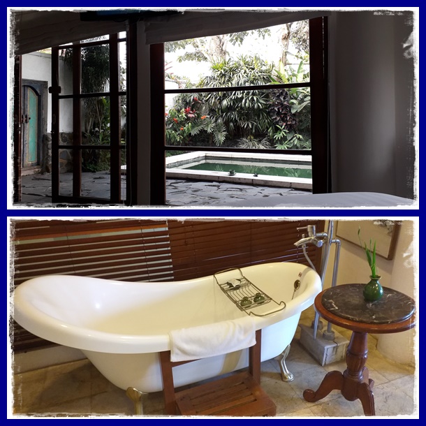 Kamar mandi yang luas dengan meja dan lantai marmer sudah biasa. Tapi yang ini ada tambahannya. Bath tub yang sangat unik, bentuknya mirip bath tub untuk bangsawan jaman dulu yang ada di film2. Aaah… asik banget deh pokoknya. Belum lagi di teras sudah terlihat private pool yang sangat mengundang. Soo…excited !