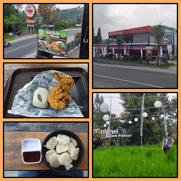 Habis berenang apalagi udara dingin, kan bikin lapar ya. Jadilah kami cari makan yang dekat saja. Persis di depan Hotel Novus, tinggal nyebrang aja jalan kaki. Ada resto D’Colonel, resto fast food ayam gitu tapi agak unik menu2nya. Lebih ke rasa lokal gitu. Kami pilih menu nasi liwet dan ayam, lalu juga pesan cireng. Oke sih rasanya.