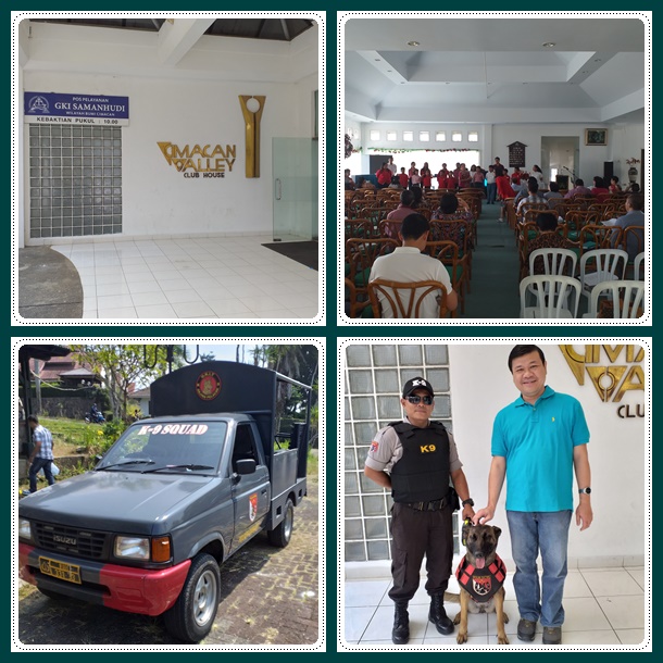 Karena rencana balik Tangerang masih nanti sore dan pastinya ga keburu ke gereja, jadi kami pergi ibadah pagi ini saja ke gereja di area Puncak. Ada pos dari GKI Samanhudi yang berlokasi di Perumahan Bumi Cimacan, tidak jauh dari Hotel Novus. Ibadah dilakukan di Cimacan Valley Club House nya, dengan pendeta yang khusus datang dari Jakarta. Selesai ibadah, ada patroli K-9 dari Polres Cianjur. Mereka membawa seekor anjing herder bernama Elsa yang baru berumur 2 tahun dan menjadi rebutan untuk foto bersama karena lucu dan gagah.