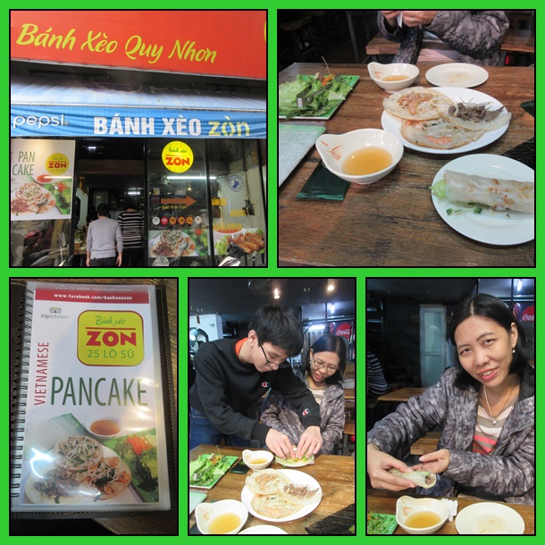 Untuk makan siang, kami menuju Banh Xeo Zon, yang direkomendasikan marketing hotel. Masuk unggulan di Trip Advisor juga ternyata, mestinya enak nih. Banh Xeo itu nama makanan khas Vietnam yang disebut Vietnamese pancake. Zon itu nama restonya. Tempatnya tidak terlalu besar. Kami pesan menu andalan nya itu donk, ternyata 1 porsi dapat 3 pancake dan topping nya bisa pilih. Kami pilih topping udang, ayam, babi. Harganya VND. 75.000. Selain itu kami juga pesan pho, karena kuatir ga kenyang.