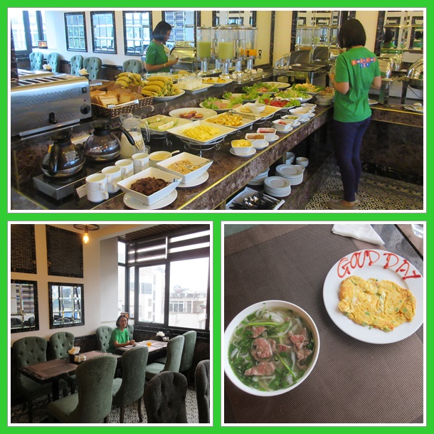 Kamar kami terletak di lantai 4 dan tidak ada lift, jadi kami menuruni tangga ke ruang breakfast. Tempat breakfastnya kecil, hanya terdiri dari 2 meja masing2 buat 4-6 orang, tapi jadi memungkinkan untuk berinteraksi dengan tamu yang lain. Ada beberapa pilihan menu breakfast. Kami pilih noodles with chicken dan bread+jam+omelette. Bisanya supaya aman, memang kami pilih ada yang menu barat standar dan menu lokal. Jika perlu air putih, disediakan air mineral galon di dekat tempat makan. Maklum, di hotel ini air mineral botol ada di kamar tapi harus bayar, bukan dikasi gratis untuk tamu. Catatan : Ingat, jika ada botol air mineral di kamar hotel di Vietnam, tanya dulu itu gratis atau bayar. Pagi ini cuaca dingin banget disertai hujan rintik, jadi kami ga banyak eksplorasi sekitar hotel.