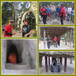 Udara di dalam tunnel sangat terbatas, rasanya badan sudah bukan keringetan lagi tapi mandi keringat saking basah kuyupnya. Kaki pegal, lutut sakit karena banyaknya bergesekan dengan lantai tunnel, memang hanya untuk yang berani terima tantangan nih. Ada satu peserta grup kami nyaris pingsan, jadi sudah tergeletak di salah satu titik tunnel yang agak lega. Padahal anak muda dan pria loh. Langsung dibantu sih oleh tour guide kami dan tour guide lokal, dikasi minyak angin dan dikipas2in. Kami pun melewati situasi ini dan akhirnya… yes… ada cahaya dan udara segar. Whoaaa… finish ! Ternyata yang masuk tunnel panjang ini dan bertahan sampai finish hanya sedikit loh, tidak sampai 20 orang. Kebayang ga tuh dulu saat perang kayak gimana menderitanya para pejuang itu. Duuuh… kita gini aja udah kepayahan.