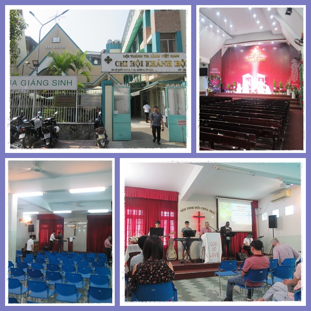 Saat ibadah, cukup banyak pengunjungnya. Sekitar 70 orang. Ada warga lokal, bule yang memang stay di HCMC dan ada juga yang turis. Selain kami ada juga turis dari Singapore, Australia, New Zealand, Thailand, bahkan Brunei Darussalam nih. Wah, ga nyangka. Ibadahnya cukup universal, tidak ada tata ibadahnya. Hanya nyanyi cukup banyak lagu sambil berdiri, kemudian kotbah, persembahan dan nyanyi lagi. Simple banget, seperti persekutuan ya.