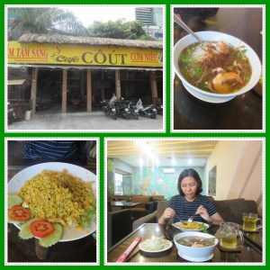 Selesai ibadah, kami lihat di sebelah gereja ada restoran Café Cout, menyediakan makanan Vietnam. Ya udah, coba ini aja untuk lunch. Tempatnya cukup luas, sebagian besar terbuka dan banyak pengunjung yang merokok. Kami diarahkan pelayan ke dalam ruangan tertutup dan ber AC. Wah.. ini jauh lebih enak. Duduknya juga di sofa. Tidak ada yang bisa berbahasa Inggris di sini, baik owner maupun para pelayannya. Untungnya ada menu bahasa Inggris dan selebihnya gunakan saja bahasa isyarat. Rasanya enak dan harganya reasonable. Untuk minum, kami disuguhi gelas besar (seperti gelas bir) berisi air kuning, gratis. Kami sempat bertanya apakah itu bir ? Mereka geleng2 tapi ga bisa jelasin itu apa. Akhirnya kami coba minum, aaah…ternyata rasa teh. Lucu juga ada teh warna kuning emas begini.