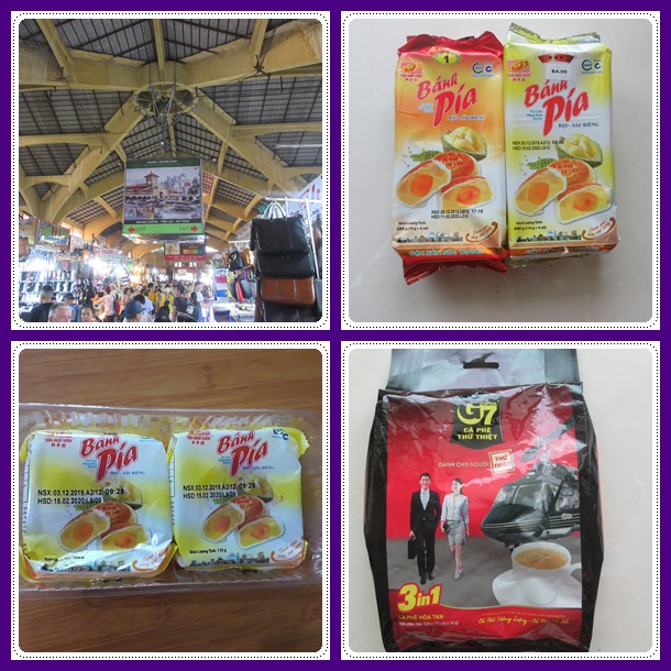 Benh Tanh Market adalah salah satu pasar souvenir dan oleh2 yang katanya wajib dikunjungi turis. Kalo di kantor pos kan tidak ada jualan oleh2 makanan, nah jadi kalo mau bisa beli di sini. Yang banyak adalah kopi dan Banh Pia. Kopi G7 yang terkenal sebagai oleh2 itu ada di mana2, jadi beli saja di supermarket daripada di sini. Banh Pia duren juga terkenal sebagai oleh2 dari Vietnam. Merknya pun macam2. Yang paling terkenal adalah merk Dau Sau Rieng yang seperti di foto atas. Ada yang dengan telur asin ada yang tanpa telur untuk vegetarian. Merk ini tidak kami jumpai di supermarket biasa. Adanya di tempat turis. 1 pak berisi 4 pia yang dikemas tersendiri, jadi memang mudah untuk dibagi2 menjadi oleh2. Menurut kami sendiri Banh Pia duren paling murah ya di Benh Thanh Market ini atau paling engga beli di HCMC deh. Di Hanoi harganya cukup mahal.