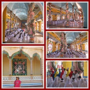 Cao Dai ini sudah ada sejak tahun 1926. Kalo cari di Wikipedia, banyak sumber yang dapat dibaca tentang agama ini. Agama ini mencampurkan beberapa agama seperti Buddha, Tao, Konfusius, Kristen, Katolik dan Islam. Di dalam gedung penuh dengan ornamen dan arsitektur yang menarik, mirip2 kuil atau vihara gitu ya dalamnya. Terdapat banyak patung di dalam temple ini, termasuk patung mirip Tuhan Yesus. Nah kan bener, ini agama campuran banget. Hehe..