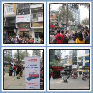 Tak lama, dimulailah pemanggilan peserta tour. Ada staf TNK Travel yang mengumumkan rute/nama tour dan nomor bisnya melalui pengeras suara. Kemudian ada staf TNK Travel mengangkat papan rute tsb dan berjalan melewati kerumunan calon peserta tour kemudian menuju bis nya. Persis seperti gadis pembawa papan ronde pertandingan tinju. Ada yang tour ke Mekong Delta River, ada yang ke Cu Chi Tunnel, ada yang city tour, macem2 deh. Ini juga dibagi lagi, misalnya Mekong 1 day tour, Mekong 2 day tour, Cu Chi half day, City tour half day, dsb. Kami ikut yang Cu Chi Tunnel dan Cao Dai Temple. Cao Dai adalah nama salah satu agama yang hanya ada di Vietnam. Menarik kan.