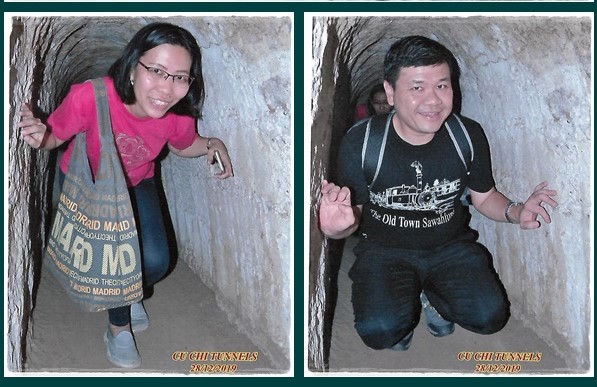 Oya, di salah satu terowongan yang cukup rendah langit2nya tapi tidak terlalu panjang dan masih agak lega dikit, sempat kaget karena ada ibu2 yang menyuruh kami senyum. Posisinya di belokan tunnel, jadi ada ruang sedikit untuk dia duduk. Oalah… ternyata dia ambil foto kami. Hebat ya, tau aja bahwa ga mungkin kami ambil foto di tengah2 tunnel karena gelap dan sempit. Foto ini dapat dibeli sebagai souvenir di area pintu keluar kompleks cu chi tunnel. Harganya VND.50.000 per pcs, cukup murah ya.. jadinya ya semua orang pada beli fotonya.