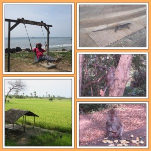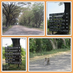 Jalanan terasa teduh karena banyak pohon besar. Saat berkendara ternyata kami berjumpa dengan beberapa monyet di tengah jalan nih. Seru juga. Kami sempat berhenti dan monyet itu berusaha mendekati mobil. Sebaiknya sih jangan keluar mobil ya, kuatir monyetnya agresif.