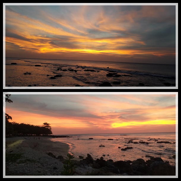 Melihat sunset di hotel ini adalah satu keharusan. Sore ini matahari terbenam di tengah awan, sehingga tadinya kami pikir ga akan bagus. Biasanya kan untuk sunset yang dicari adalah matahari bulat keemasan yang turun ke balik laut. Yang kadang-kadang buat kami jadinya agak bosan sih. Tapi ternyata Tuhan memberikan lukisan alam yang lain, yang justru luar biasa indah. Semburat sinar matahari di balik awan yang bikin WOW, Speechless ! Betul2 Maha Karya yang Luar Biasa. Warnanya, bentuknya, aaah… kami hanya bisa terdiam, memandang dan menikmati. Bersyukur atas moment2 indah yang Tuhan masih berikan kepada kami berdua. How Great Thou Art !