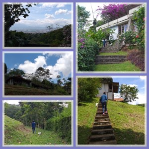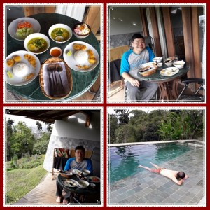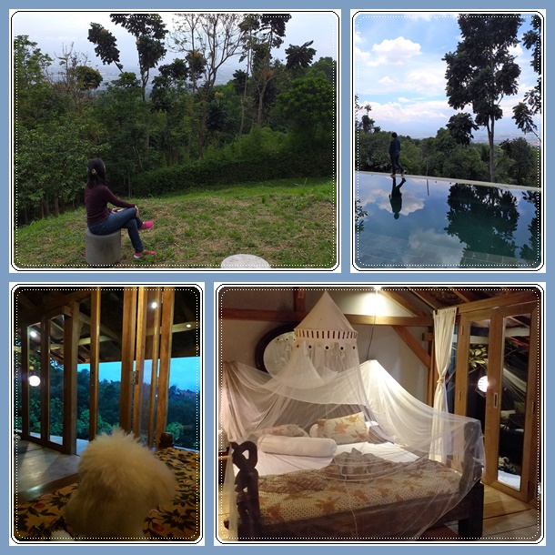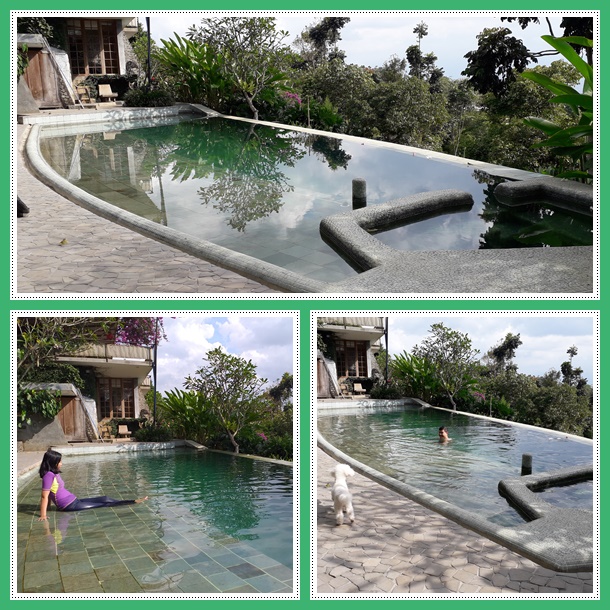 Siang ini jadinya kami makan siang bekal gudeg di teras sambil menikmati cuaca yang cerah hari ini. Padahal sebelum kami datang, infonya cuaca hujan terus. Setelah makan siang, kami menjelajah Rumah Lereng ini. Areanya luas dan naik turun, cocok buat yang senang olah raga dan aktivitas fisik. Kolam renang terletak agak jauh dari kamar, harus melewati taman dan tangga. Sangat menyenangkan buat binatang peliharaan yang senang jalan2 seperti Miki.
