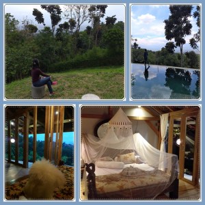 Semua kamar bernuansa etnis, perabot dan ranjang kayu gitu, termasuk lantainya dari kayu. Tidak ada TV maupun AC di kamar. Ga perlu AC juga sih karena suhu udara nya dingin di sini, kan terletak di lereng gunung betulan. Kamar mandinya menggunakan batu alam dan menyatu dengan area kamar, tanpa pintu, cuma dinding pembatas saja. Jadi ingat dulu pas menginap di Pelabuhan Ratu, kamar mandinya juga model begini, menyatu dengan kamar. Jadi buat yang menginap sama teman di sini mungkin kurang cocok ya, hehe.. cocoknya ya pasangan