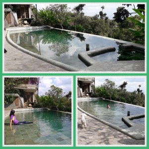Sore ini kami memanfaatkan kolam renang ini, mumpung matahari bersinar cerah dan tidak ada tamu lain yang berenang. Air kolamnya dingin, jadi kalo ada matahari lumayan lah, ada hangat2nya dikit. Nah, saat kami berenang kan Miki beredar di pinggir kolam. Memang tidak kami rantai, supaya dia bisa bebas main dan jalan2. Eh, tiba2 dia menghilang dong, entah kemana. Ditunggu kok ga nongol2 juga. Akhirnya Jeff pergi cari, ga lama setelah Jeff pergi tiba2 Miki datang dengan berlari ke arah kolam. Mukanya bahagia banget. Ga lama di pinggir kolam, dia lari lagi menuju taman. Hilang lagi dari pandangan Diana. Habis itu Jeff datang ke kolam, masih bingung karena ga menemukan Miki. Hahaha.. Padahal Miki barusan datang, ternyata mereka ga papasan toh. Astaga ! Kaya main petak umpet aja.