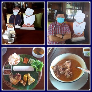 Kami kemudian mendapatkan nomor tempat duduk di resto lama. Jadi sudah diatur ya alokasi tempat duduknya supaya tetap ada jarak dengan tamu lain. Kali ini kami pesan gulai kambing dan nasi timbel komplit. Untuk minum sudah disediakan teh hangat gratis. Wah enak banget deh 2 menu ini. Kualitas makanannya sangat baik. Sendok garpu diberikan dalam kondisi tertutup plastik, jadi bersih. Selama kami makan, tamu datang terus silih berganti, padahal sudah sore nih. Oya, untuk pembayaran kami pakai kupon traveloka, lumayan dapat diskon.