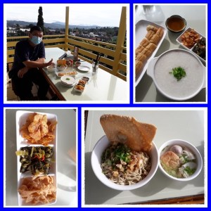 Ya sudah, kami santai2 aja dulu nih di Amen Express sekalian menunggu jalur longsor bisa dibuka kembali. Menu sarapan kami kali ini adalah bubur ayam, cakue dan mie ayam komplit. Pilihan kali ini tidak mengecewakan. Mie nya enak karena mereka produksi mie sendiri, komplit dengan baso-pangsit-tahu-babat. Buburnya pun oke, ada tambahan unik yang menyertai bubur ini, yaitu sayur asin, kentang goreng manis dan kulit pangsit goreng. Enak juga loh ternyata tambahan2 unik ini saat dimakan bersama bubur. Untuk cakue sih kami kurang suka, karena terlalu garing dan keras buat kami.