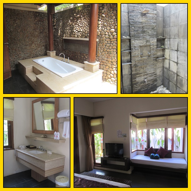 Kalo dapat akomodasi yang ada shower semi open air gini jadi ingat saat menginap di Kampung Sampireun (2011). Di sana juga modelnya alami gini, back to nature. Fasilitasnya villa ini lengkap banget menurut kami. Karena berupa villa yang luas dan ada pantry nya, jadi bisa masak sendiri, tapi bisa minta room service dari resto resort juga. Ada private pool tapi juga bisa pakai fasilitas kolam renang umum di resort. Kurang apa coba ?!