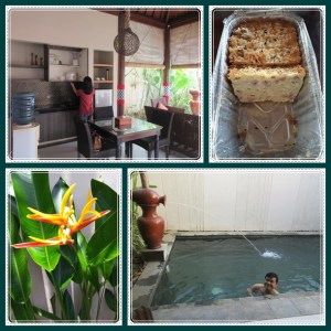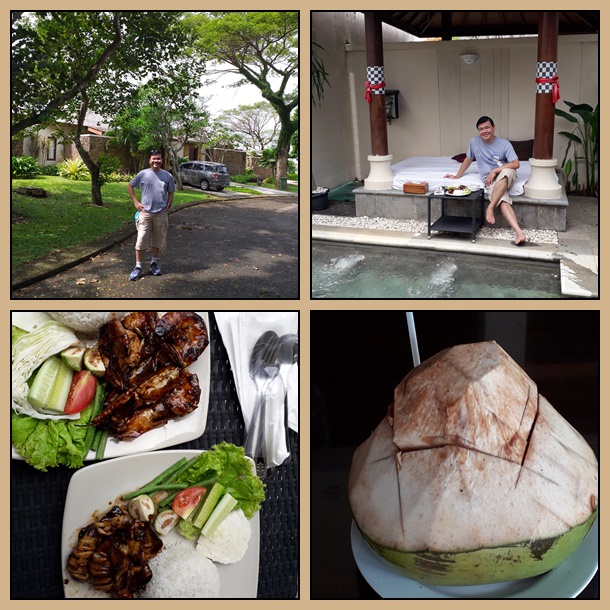 Untuk makan siang, kami sudah pesan tadi ke resto hotel untuk diantar ke villa. Jadi mau santap siang di villa saja, biar santai suasananya. Asik banget lah, bisa duduk2 makan di gazebo pinggir pool. Menu nya udang bakar dan cumi bakar, dilengkapi kelapa muda seperti biasa. Udangnya besar2, manis banget dan fresh. Kalo cumi, kami lebih suka waktu tahun lalu pesan yang goreng tepung.