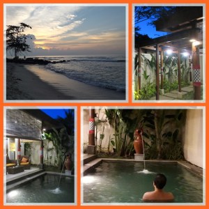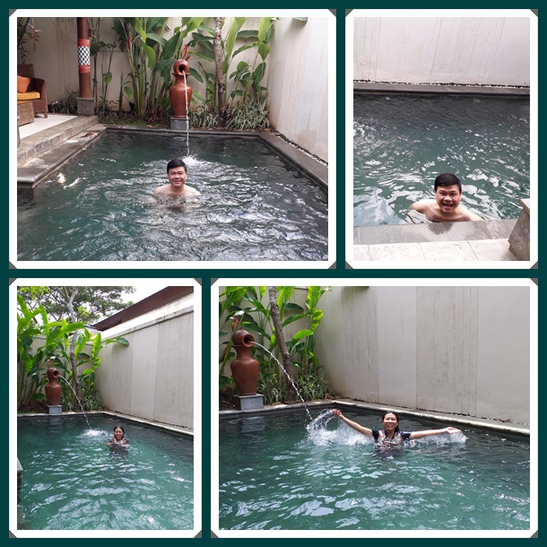 Ombaknya lumayan besar pagi ini, walau begitu tetap bisa main air kok di tepian yang landai. Jangan lupa pakai sepatu pantai ya karena di sini banyak koral dan karang, sakit jika kena kaki telanjang. Puas main air di laut, kami pun kembali ke villa untuk kembali berenang di private pool untuk terakhir kalinya. Maklum, siang ini sudah harus check-out dari villa nya, jadi puas2in nih pakai fasilitas villa nya.