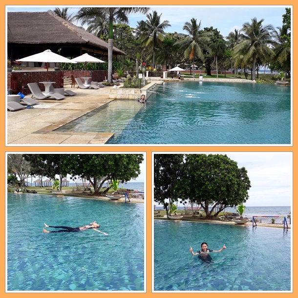 Sesudah puas main dan berenang di laut, kami pun menutupnya dengan pindah ke kolam renang. Tentunya dengan bilas dulu ya, jangan bawa pasir dan air laut ke dalam kolam renang. Dengan kondisi yang tenang, Diana pun mempraktekan uitemate, teknik mengapung dari Jepang yang terbukti pernah menyelamatkan banyak nyawa saat terjadi tsunami akibat gempa bumi tahun 2011 yang lalu. Jadi manusia pun jika tenang dan relax di atas air, bakal mengambang kok. Justru kalo panik yang bikin tenggelam.