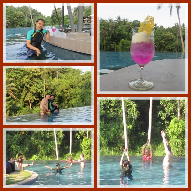 Kami ikut aqua yoga/water stretching di sore hari, seru juga nih. Yoga under water sedikit lebih sulit karena ada riak air kolam renang yang harus kita kendalikan. Selain itu kita ga bisa liat gerakan kaki dari instrukturnya karena kan dia juga ada di dalam air. Jadi ya dengarkan saja instruksinya dan anggap saja benar, haha..