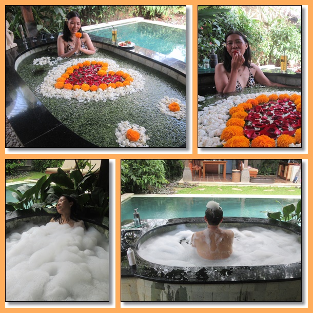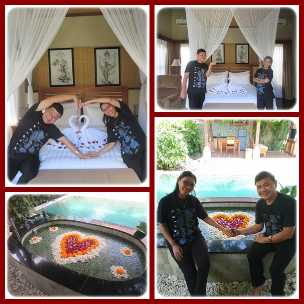 Karena ada request dari kami, maka pihak Nyuh Ubud memberikan honeymoon set up di villa kami secara gratis. Baik berupa hiasan di ranjang dan juga flower bath. Kalo hiasan di ranjang cukup standar ya. Yang istimewa adalah adanya 1 tangkai bunga mawar hidup yang diletakkan di tengah handuk angsa. Jadi bisa dibawa pulang kalo mau. Kami sih ditaro di botol air mineral saja, biar mekar. Lalu hiasan flower bath nya cantik banget !