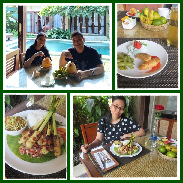 Welcome drink berupa kelapa kuning yang ditaruh di dalam kulkas. Hanya bisa diminum airnya saja seperti kelapa hijau, tapi rasanya manis dan menyegarkan. Khasiatnya juga katanya sama dengan kelapa hijau, yaitu bagus untuk kesehatan. Di meja makan juga tersedia pisang dan jeruk untuk dinikmati. Kami sempat pesan sate lilit untuk makan siang dan rasanya enaaak banget. Pas malam hari, kami juga pesan Hatten Rose Wine, buatan lokal Bali yang rasanya cocok untuk menemani dinner time bersama pasangan ! Harga makanan dan minuman di sini menurut kami cukup terjangkau.